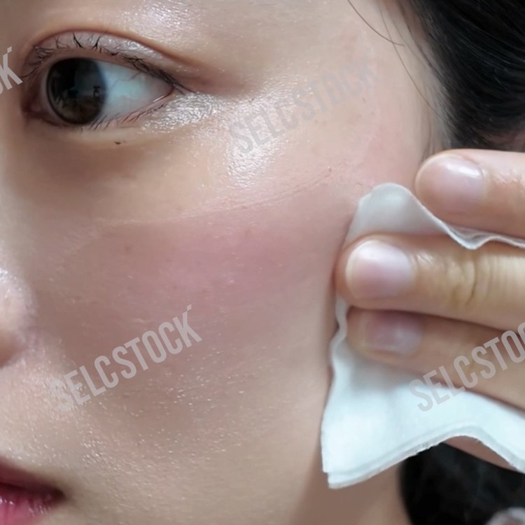 클렌징 화장솜으로 볼을 닦는 모습
